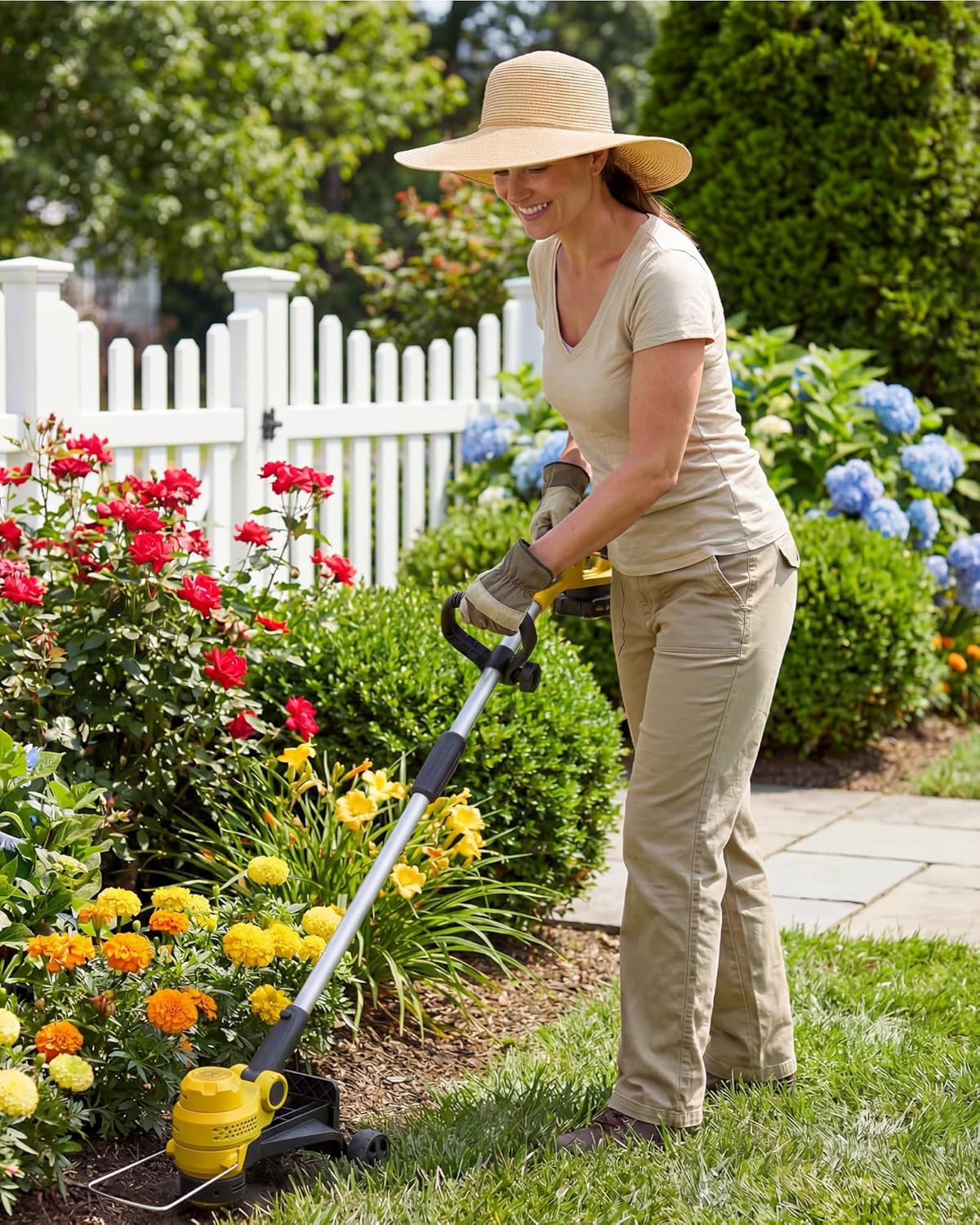 • 【Dual-Function Trimming with Flexible Cutting Angles】Switch effortlessly between trimming and edging with an adjustable cutting head designed to handle different angles and heights. The integrated guide wheel helps you create clean edges and easily navigate around obstacles for a polished lawn finish.
