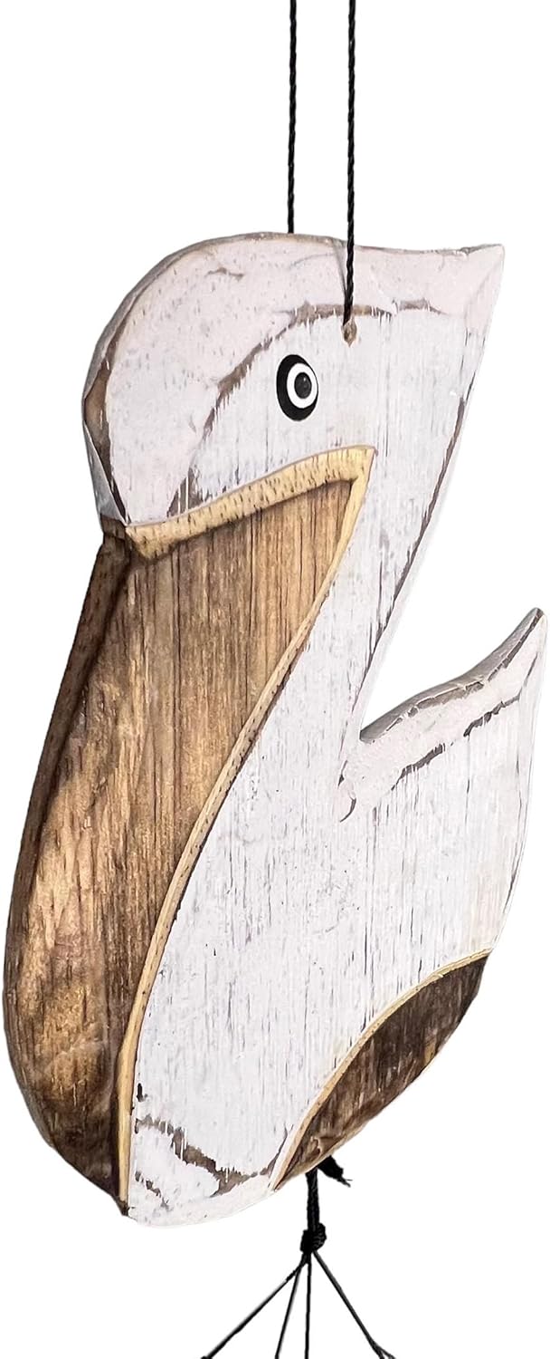 This rustic tropical pelican wind chime is a beautifully crafted piece that combines the quaint charm of distressed wood with the serene ambiance of whitewashed bamboo chimes. The wind chime is highlighted by a 7” tall x 5 1/2” wide wooden pelican topper, designed with a rustic aesthetic that evokes a sense of coastal nostalgia. Below, the chimes extend up to 12” in length, each crafted from bamboo and finished with a whitewash technique, producing deep, calming tones when stirred by the breeze. The overall length of the wind chime is 34”, making it a substantial yet elegant addition to any space. Additionally, a smaller 3 1/2” x 2 3/4” wooden pelican dangles at the bottom, acting as a wind catcher to ensure the chimes respond even to gentle breezes, enhancing the wind chime's soothing qualities.