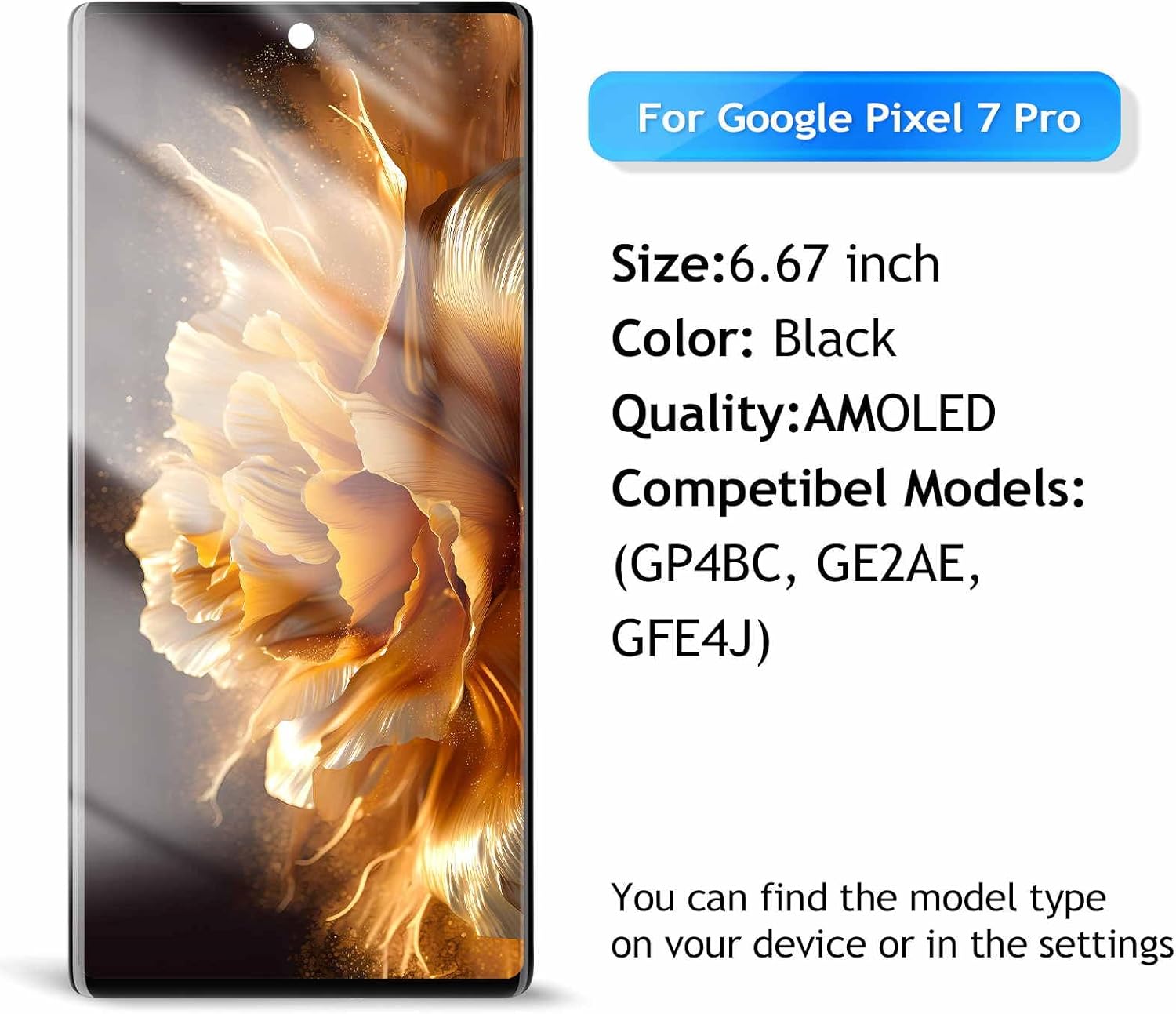 AMOLED for Google Pixel 7 Pro LCD Screen Replacement for Google Pixel 7 Pro LCD Display Touch Screen Display Assembly Repair Kits with Frame GP4BC GE2AE (With Fingerprint Function)-Package Including:1x AMOLED Pixel 7 Pro Touch Screen Assembly Replacement1x a set of install toolsInstallation Precautions:1. Check whether the product is in good condition and test it before installation. Do not remove protective film or labels during testing. Watch out for static issues.2. The screen is glass, which is a very fragile product. Testing before installation is strongly recommended3. Do not bend the cable. During installation and testing, make sure the LCD cable is not bent. Curvatures greater than 90 degrees will result in a black view.4. If your phone has a black screen during installation, press and hold the power key and volume key at the same time. If the phone vibrates, it's because the mainline is not installed properly. Then reinstall the product.5. If you are not professional in maintenance, or have no experience in repairing electronic equipment, we do not recommend you to replace the screen by yourself. Take it to a repair shop for help to save you time and money. Or find the relevant installation video on the YouTube platform and follow the installation steps to install.