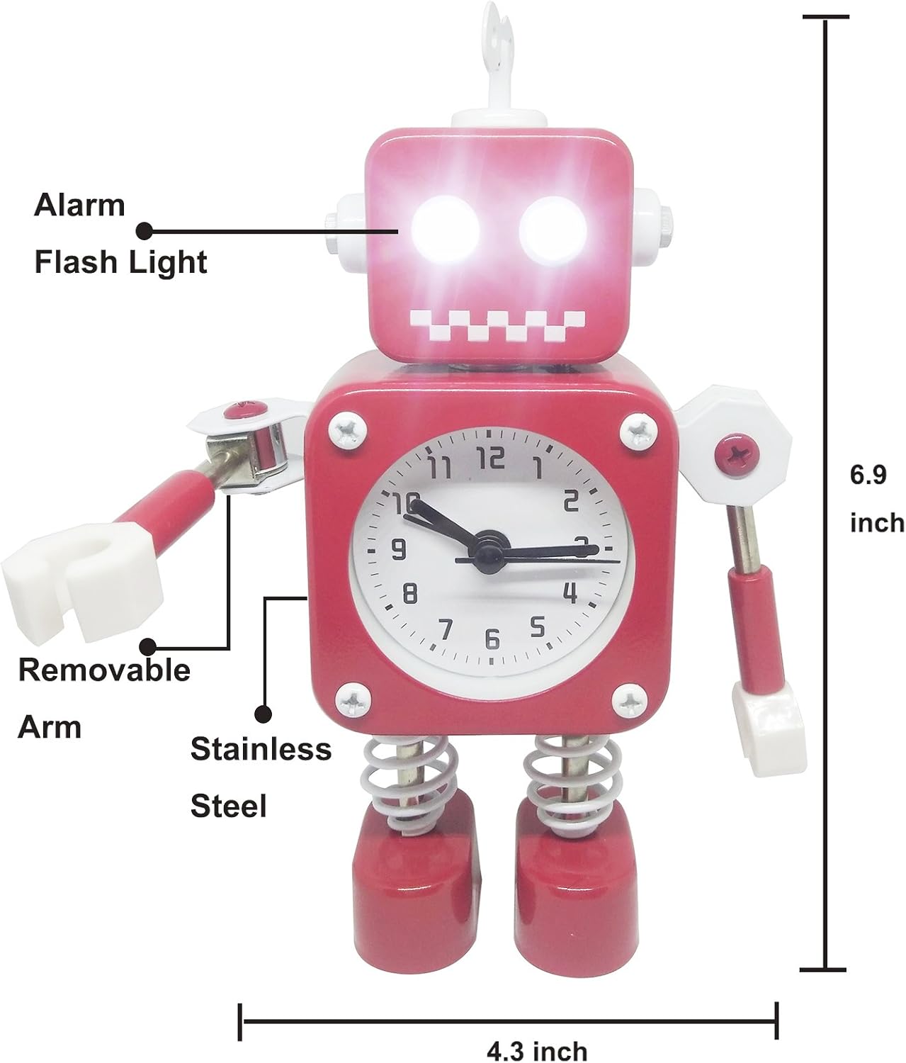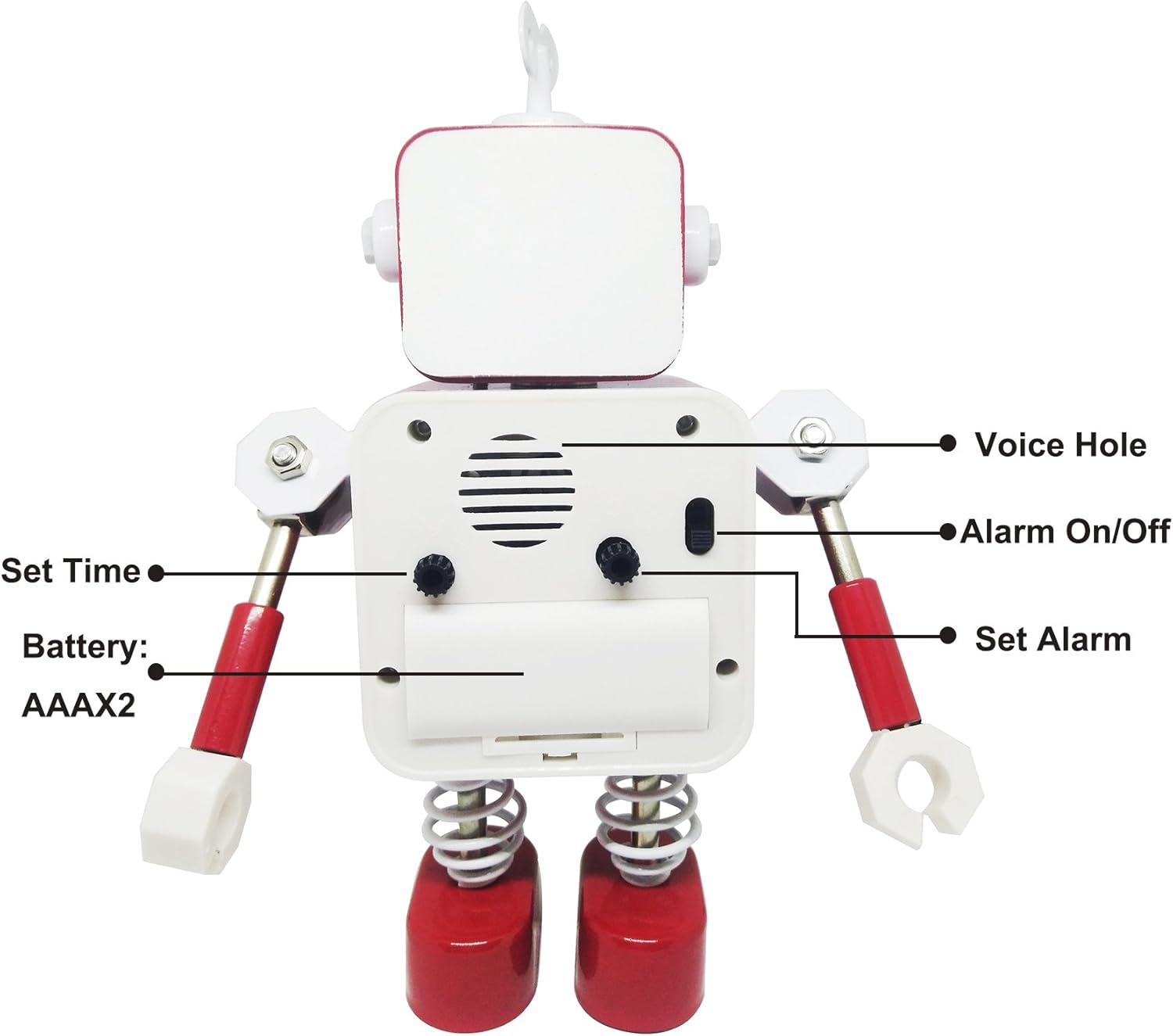 Specification:Name:cute metal robot alarm clock for kidsMaterial:metal + glassColor:red,blue,green,yellowSize:6.9 x 4.4 x 1.8 Inches.Usage:Home decor,Household life,Office.Perfect gift for kids.Function:1.Time,Alarm2.Sweep Movement:keep silent ,not ticking ,ensure a good sleep.3.Night Light:when the alarm ring,the eye will flash light.Power: 2 x AAA (1.5V) carbon zinc batteries (NOT Included)Package:white boxNoted: Please use 1 AA carbon zinc battery only (alkaline battery or rechargeable battery which may have influence on the life span of clock movement, as well as the accuracy of the time).We are a profession factory to product electronic products and our major product is clock,timer,thermometer and lamp.Enjoy the best time with you.